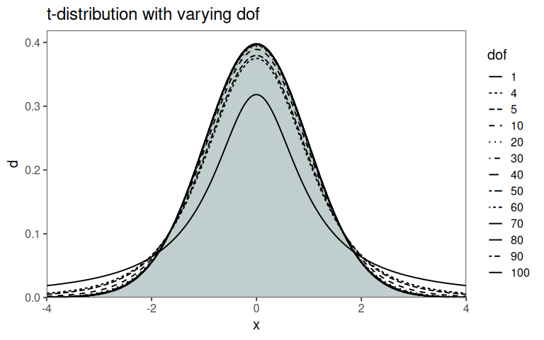 t Distribution The t Distribution is related to the normal distribution and depends on dof. As dof increases, the t-distribution approaches the standard normal distribution (Figure 2.42).