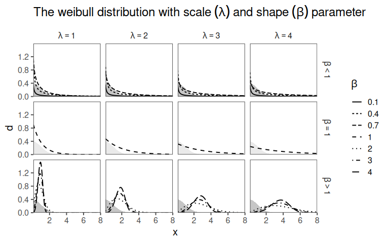 If \(\beta < 1\), the distribution has a decreasing failure rate, indicating that the probability of an event occurring decreases over time. This is often associated with “infant mortality” or early-life failures. If \(\beta = 1\), the distribution follows an exponential distribution with a constant failure rate over time. If \(\beta > 1\), the distribution has an increasing failure rate, suggesting that the event becomes more likely as time progresses. This is often associated with “wear-out” failures.